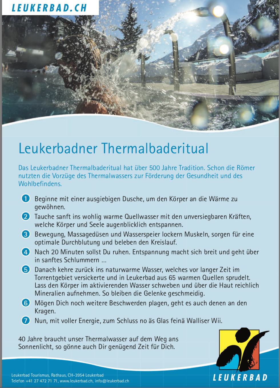 Das Leukerbadner Thermalbaderitual hat über 500 Jahre Tradition. Schon die Römer nutzten die Vorzüge des Thermalwassers zur Förderung der Gesundheit und des Wohlbefindens. 40 Jahre braucht unser Thermalwasser auf dem Weg ans Sonnenlicht, so gönne auch Dir genügend Zeit für Dich.