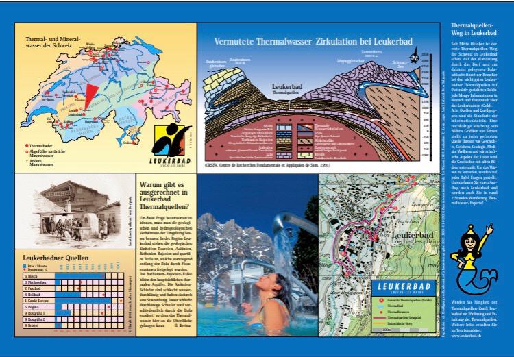 Zum internationalen Jahr des Wassers wurde der erste Thermalquellen-Weg der Schweiz in Leukerbad eröffnet. Auf der zweistündigen Wanderung durch das Dorf Leukerbad und zur dahinter gelegenen Dalaschlucht lernen Spaziergänger Wissenswertes über die gefassten Quellgruppen Leukerbads, die Geologie, die Geschichte oder die medizinischen und wirtschaftlichen Aspekte des Thermalwassers «Leukerbadner Gold», auf neun illustrierten Tafeln kennen.